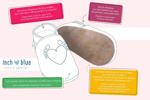 L’histoire de la marque Inch Blue commence en 1999, lorsque Rhiannon Owen, entrepreneuse dynamique et créative, commence à fabriquer des chaussons pour bébé dans sa cuisine ! En 2004, la marque a déjà bien grandi. Devenue référence pour les parents et les boutiques de chaussures pour enfant, ces adorables chaussons en cuir souple naturel sont fabriqués à la main en Grande-Bretagne et sont certifiés sans chrome. La collection Inch Blue accueille régulièrement de nouveaux modèles, qui enchanteront les petits pieds de bébés, de 0 à 24 mois. Une excellente idée cadeau !
