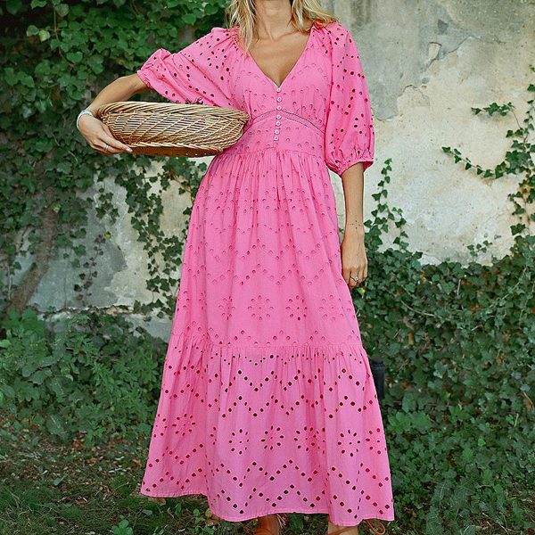 -Robe longue en broderie ajourée -Manches 3/4 en volume -Décolleté en V -Boutonnée sur le buste -Légèrement évasée sur le bas de jupe -Large volant sur le bas de jupe -Longueur depuis l’épaule 135cm pour une taille S