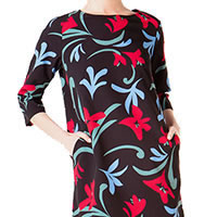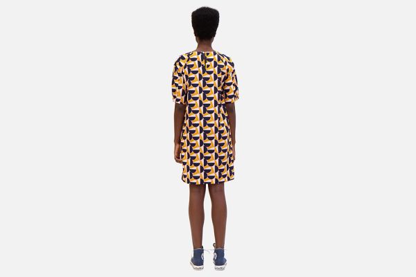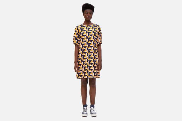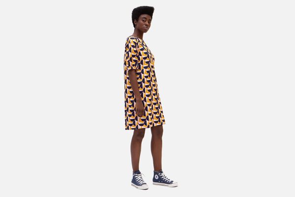 – This may look like a simple dress, but the set-in sleeves give it special allure. Thanks to the straightforward cut, all attention is drawn to the pink, ochre and dark blue graphic print