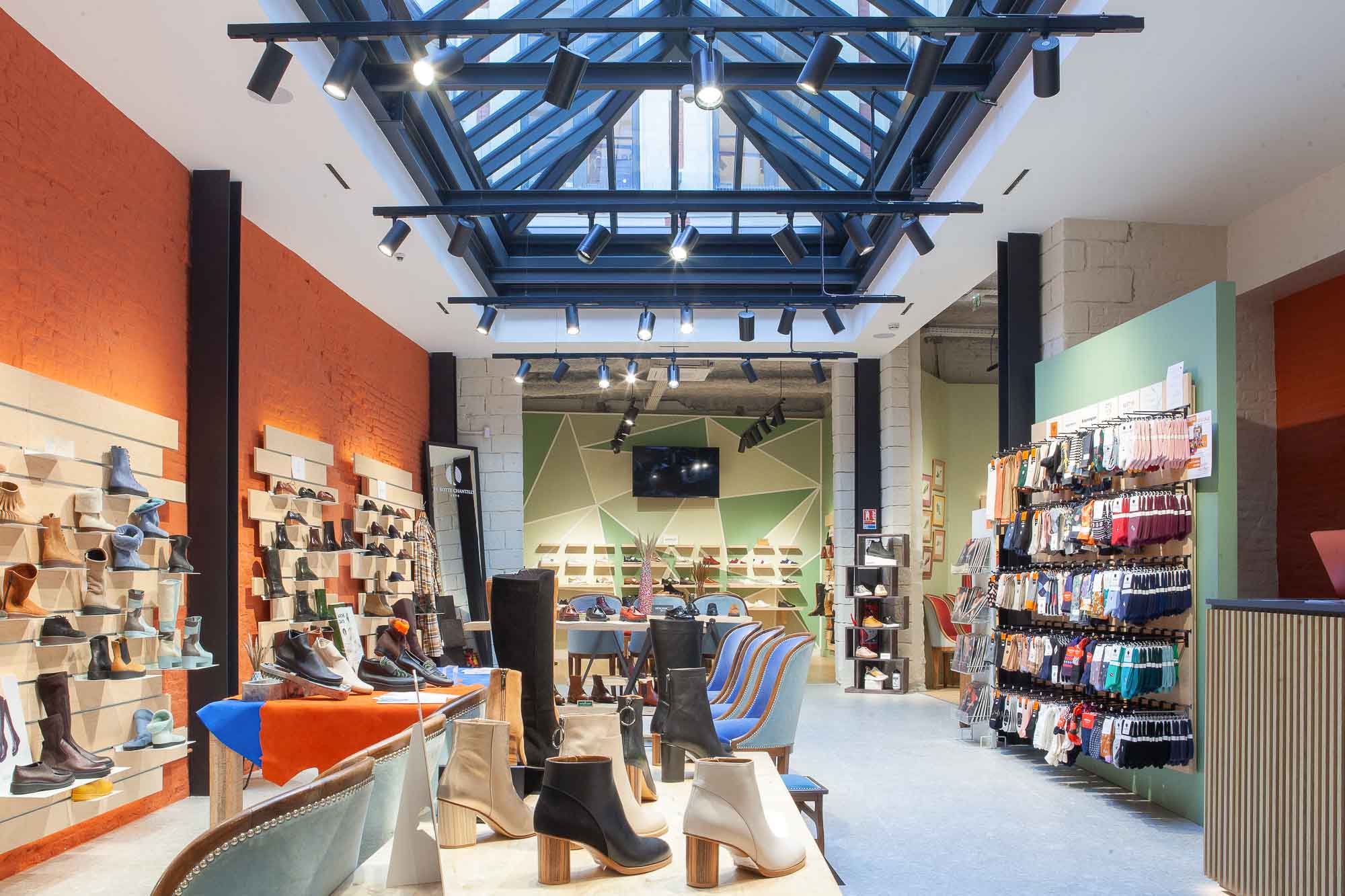 Au rez-de-chaussée, les collections de chaussures femme sont mises en valeur autour d’une magnifique verrière qui illumine l’ensemble.