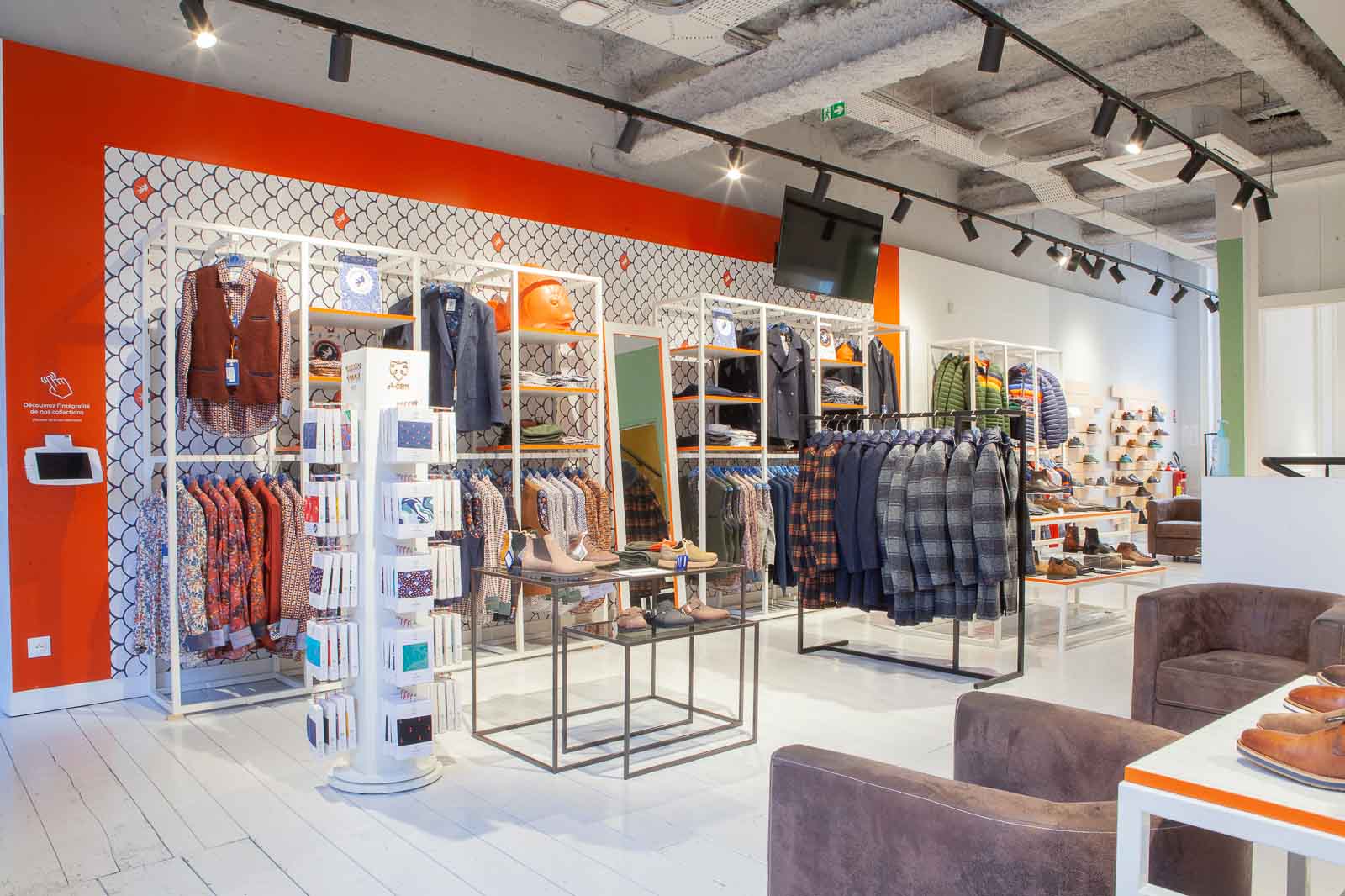 Au premier étage, place aux hommes : du sneaker au soulier cousu Goodyear, il y a là de quoi équiper ces Messieurs. Les corners LLOYD, Tod’s, Hogan, Voile Blanche, Paraboot, Geox, Mephisto et des créateurs italiens en exclusivité, dévoilent leurs créations. À ne pas manquer : le salon dédié aux exceptionnelles so British shoes signées Crockett & Jones. Et pour finir la silhouette avec classe, difficile de résister à la collection de chemises — mais pas que — A Fish Named Fred.