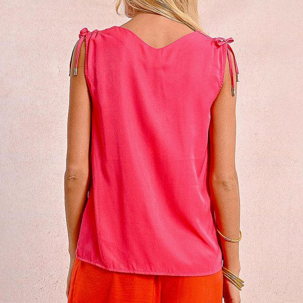 -Top droit à col V -Détail fantaisie nœud à nouer sur les épaules -Longueur depuis l’épaule 64cm pour une taille S