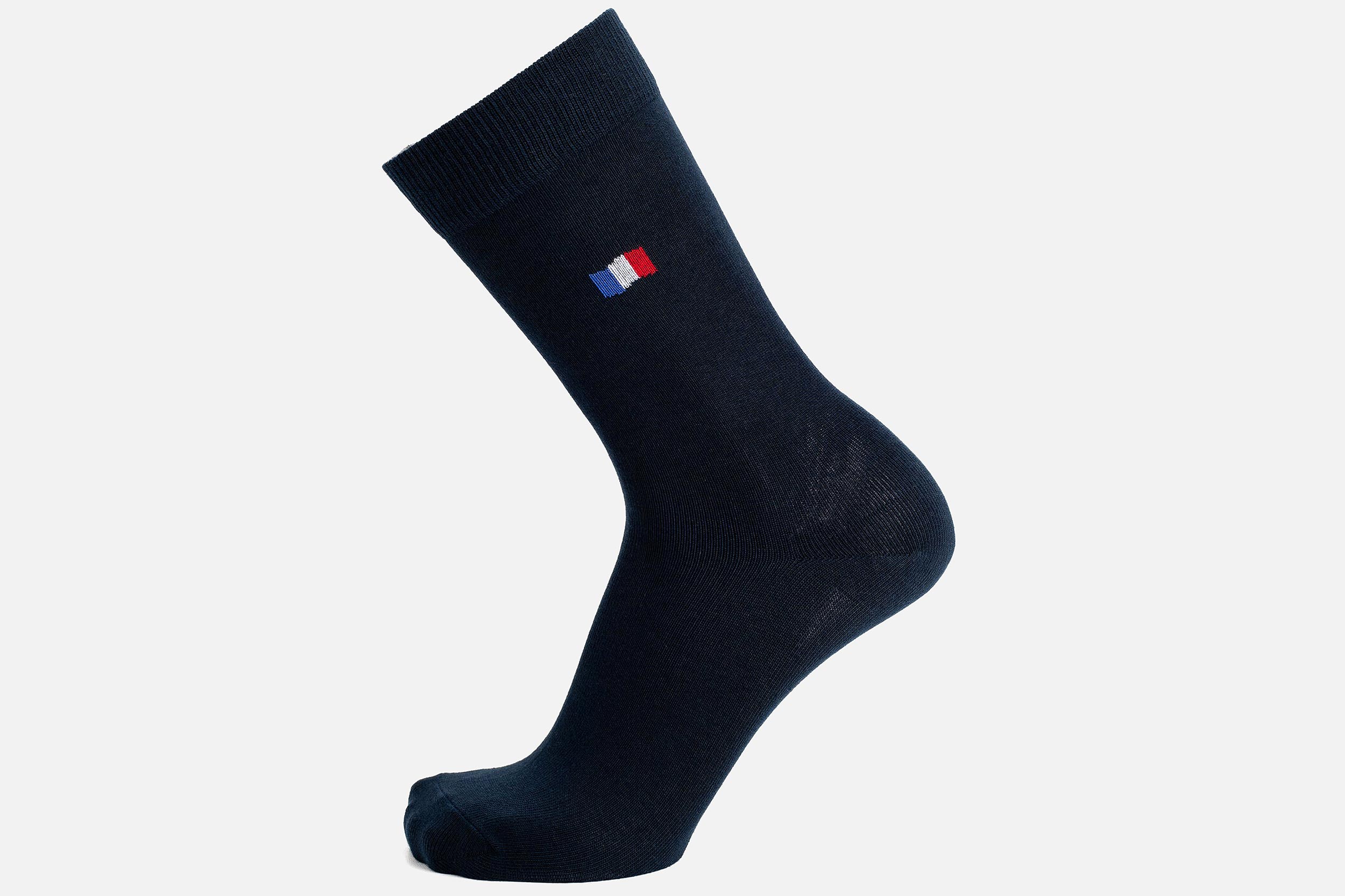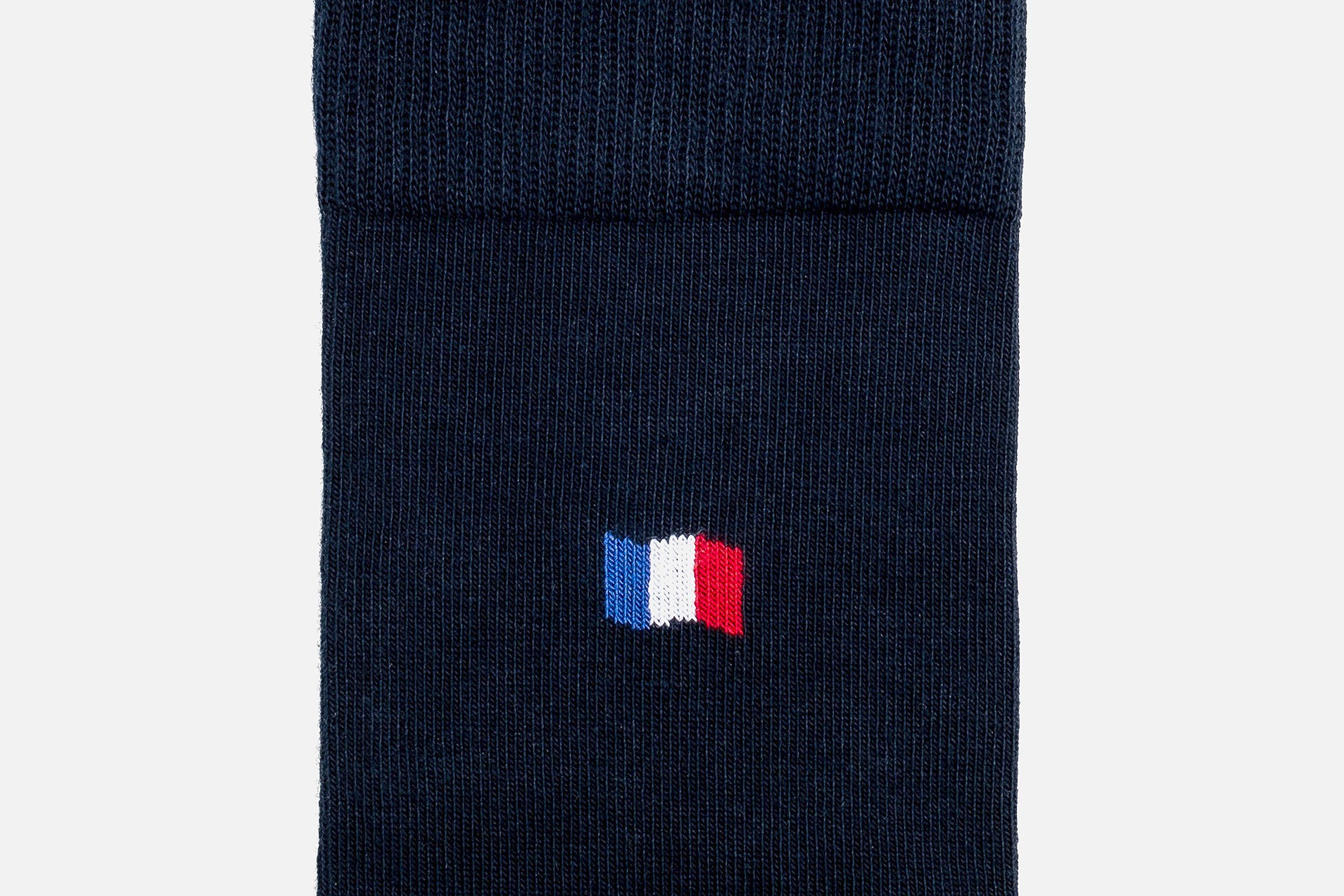 Caractérisée par une jolie teinte bleu marine unie, cette chaussette arbore avec fierté un petit drapeau français sur sa tige. Envie d’apporter une touche légère de patriotisme à votre tenue ? C’est le modèle qu’il vous faut. Indémodables et intemporelles, ces chaussettes s’accordent aussi bien à un costume chic qu’à un look du quotidien.